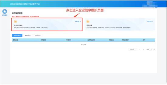 企業(yè)需要先進(jìn)行企業(yè)信息維護(hù),才可進(jìn)行資質(zhì)申請。點(diǎn)擊工程設(shè)計(jì)資質(zhì)功能模塊頁中“企業(yè)信息維護(hù)”進(jìn)入企業(yè)信息維護(hù)頁面。