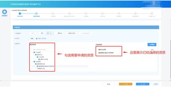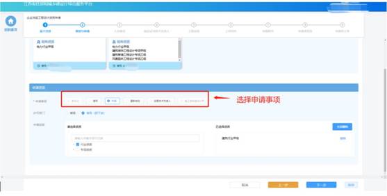 在“資質(zhì)與申請”環(huán)節(jié)頁面,企業(yè)選擇申請事項(xiàng)以及申請資質(zhì)。