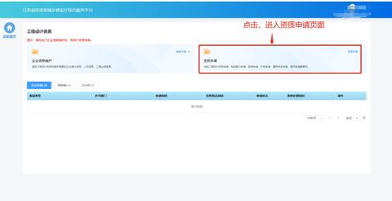 在進(jìn)行企業(yè)信息維護(hù)后,點(diǎn)擊工程設(shè)計(jì)資質(zhì)功能模塊頁中“資質(zhì)申請”進(jìn)入資質(zhì)申請頁面。