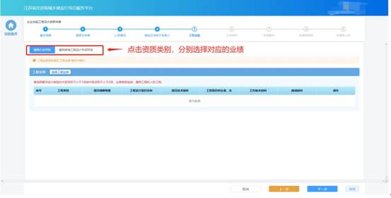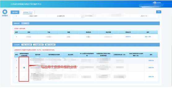 若申請的資質(zhì)對于企業(yè)業(yè)績有要求,則申報流程會包含“工程業(yè)績”環(huán)節(jié)。在“工程業(yè)績”環(huán)節(jié)頁面,企業(yè)按照所申請資質(zhì)類別分別選擇對應(yīng)的業(yè)績。點(diǎn)擊“選擇工程業(yè)績”按鈕,選擇用于本次申報的業(yè)績。