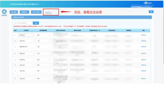 在企業(yè)業(yè)績頁面中查看企業(yè)工程業(yè)績信息。目前業(yè)績數(shù)據(jù)來自江蘇省建筑市場監(jiān)管與誠信信息一體化平臺,無需企業(yè)手動進(jìn)行維護(hù)。