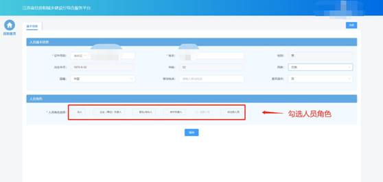在“人員角色”板塊勾選人員對應(yīng)的角色,并填寫角色對應(yīng)的工作信息、