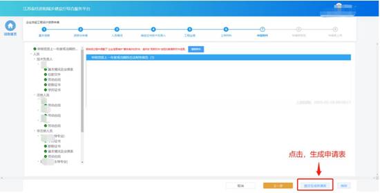 “申報附件”環(huán)節(jié)頁面展示本次申請相關(guān)的附件信息,部分附件信息來自于企業(yè)信息維護(hù)模塊維護(hù)的附件,部分附件來自于申報過程中在“上傳材料”環(huán)節(jié)上傳的附件。確認(rèn)附件內(nèi)容后,點(diǎn)擊“提交生成申請表”則系統(tǒng)自動生成申請表并進(jìn)入申請表預(yù)覽頁面。