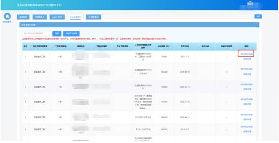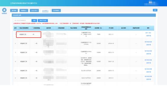 在企業(yè)業(yè)績頁面中查看企業(yè)工程業(yè)績信息。目前業(yè)績數(shù)據(jù)來自江蘇省建筑市場監(jiān)管與誠信信息一體化平臺,無需企業(yè)手動進行維護。其中“對應(yīng)工程類別要求”或“工程類別等級”若無數(shù)據(jù),需按照真實情況手動進行維護