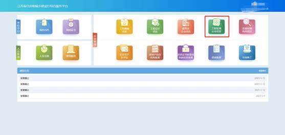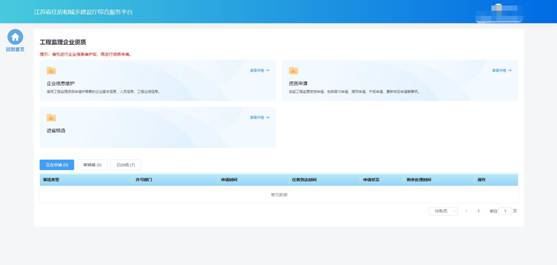 點擊首頁“企業(yè)管理”模塊中“工程監(jiān)理企業(yè)資質(zhì)”圖標(biāo)可進入工程監(jiān)理企業(yè)資質(zhì)功能模塊頁進行相關(guān)業(yè)務(wù)維護和辦理。