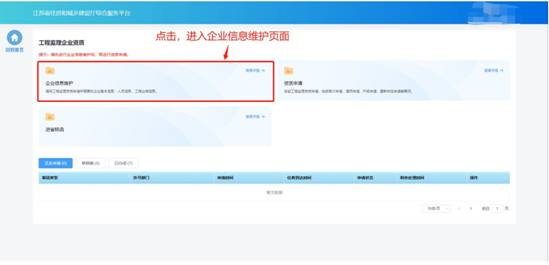 企業(yè)需要先進行企業(yè)信息維護,才可進行資質(zhì)申請。點擊工程監(jiān)理企業(yè)資質(zhì)功能模塊頁中“企業(yè)信息維護”進入企業(yè)信息維護頁面。