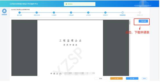 “申請表預(yù)覽”頁面展示系統(tǒng)根據(jù)企業(yè)填報的內(nèi)容自動生成的申請表,點擊“下載申請表”按鈕下載申請表Pdf文件,企業(yè)將申請表打印后進行蓋章,然后點擊“下一步”按鈕上傳蓋章掃描件。