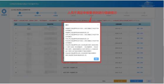 申請資質(zhì)的資質(zhì)標(biāo)準(zhǔn)對選擇的人員類型、數(shù)量進行初步校驗,對于不滿足要求的人員進行錯誤提示。若選擇人員滿足要求則進入下一個環(huán)節(jié)。