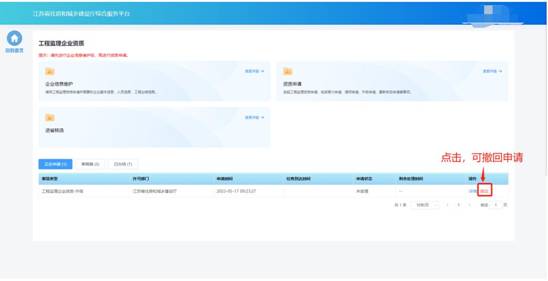 “正在申請”板塊中展示企業(yè)端已經(jīng)提交的、目前處于審核流程中的事項申請。在管理端受理之前,企業(yè)端可點擊操作列中的“撤回”按鈕撤回事項申請。