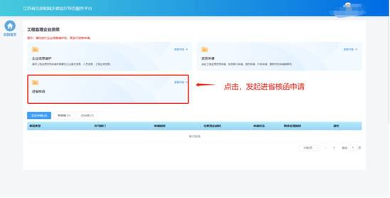 企業(yè)吸收省外工程監(jiān)理企業(yè)資質(zhì)之前,需要先對省外工程監(jiān)理企業(yè)資質(zhì)進行進省核函。點擊工程監(jiān)理企業(yè)資質(zhì)功能模塊頁中“進省核函”圖標(biāo)發(fā)起對省外企業(yè)資質(zhì)的核函申請。后續(xù)其他步驟說明可參考建筑業(yè)企業(yè)-進省核函。