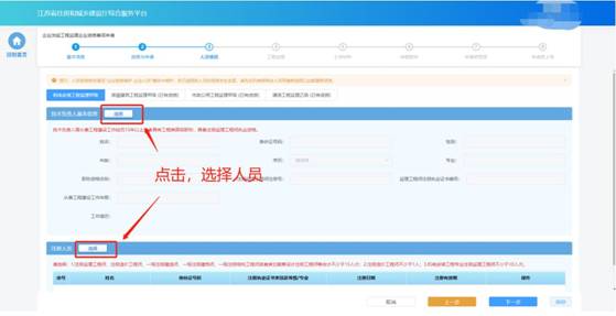 在“人員情況”環(huán)節(jié)頁面,企業(yè)按照所申請資質(zhì)類別分別選擇對應(yīng)的各類人員。選擇的人員信息為企業(yè)在“企業(yè)信息維護”頁面已經(jīng)維護的對應(yīng)角色的人員,如有信息不正確或者信息缺失,需返回“企業(yè)信息維護”頁面進行修改或補充后,再繼續(xù)進行申請。另外,對于當(dāng)前企業(yè)已有的監(jiān)理資質(zhì),也需要企業(yè)再選一遍對應(yīng)的人員。