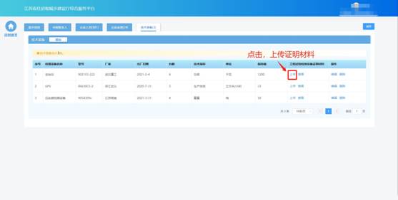 添加設(shè)備后,在“工程試驗檢測設(shè)備證明材料”列中點擊“上傳”按鈕
