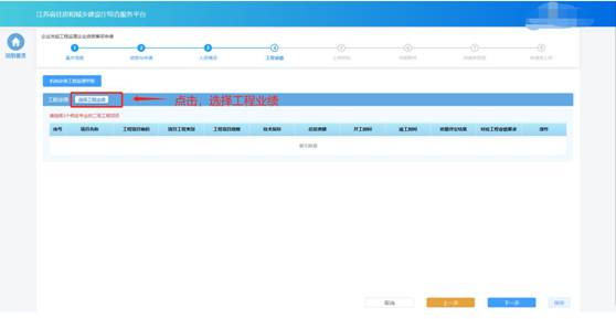 若申請的資質(zhì)對于企業(yè)業(yè)績有要求,則申報流程會包含“工程業(yè)績”環(huán)節(jié)。在“工程業(yè)績”環(huán)節(jié)頁面,企業(yè)按照所申請資質(zhì)類別分別選擇對應(yīng)的業(yè)績。點擊“選擇工程業(yè)績”按鈕,選擇用于本次申報的業(yè)績。
