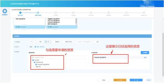 在“資質(zhì)與申請”環(huán)節(jié)頁面,企業(yè)選擇申請事項以及申請資質(zhì)。