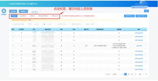 在企業人員頁面中維護企業人員信息。其中,三類人員信息來自江蘇省建筑業監管信息平臺2.0,無需企業手動添加。