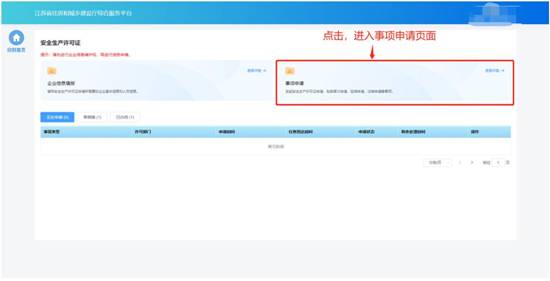 在完成企業信息維護后,點擊安全生產許可證功能模塊頁中“事項申請”進入事項申請頁面。