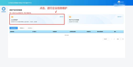 點擊首頁“企業(yè)管理”模塊中“房地產(chǎn)估價機構(gòu)備案”圖標可進入房地產(chǎn)估價機構(gòu)備案功能模塊頁進行相關(guān)業(yè)務維護和辦理。