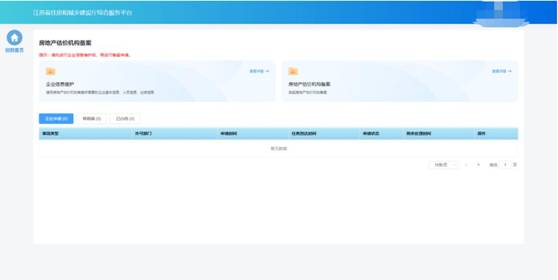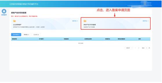 在完成企業(yè)信息維護后,點擊房地產(chǎn)估價機構(gòu)備案功能模塊頁中“房地產(chǎn)估價機構(gòu)備案”進入備案申請頁面。