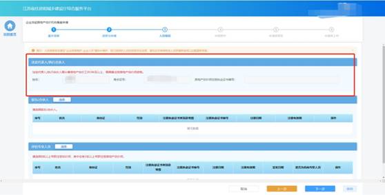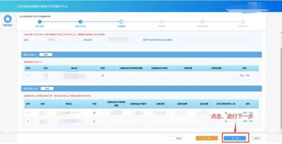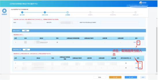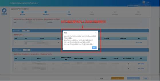 事項申請需要的人員選擇完成后,點擊“下一步”按鈕,系統(tǒng)會按照申報要求對選擇人員進行初步校驗,對于不滿足要求的人員進行錯誤提示。若選擇人員滿足要求則進入下一個環(huán)節(jié)。