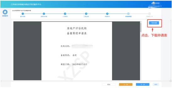在“申請表預覽”頁面展示系統(tǒng)根據(jù)企業(yè)填報的內(nèi)容自動生成的申請表,點擊“下載申請表”按鈕下載申請表Pdf文件,企業(yè)將申請表打印后進行蓋章,然后點擊“下一步”按鈕上傳蓋章掃描件。
