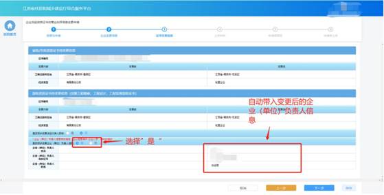 n 如果需要同步變更企業(yè)(單位)負(fù)責(zé)人信息,則先在監(jiān)理/勘察/設(shè)計(jì)的企業(yè)信息維護(hù)-企業(yè)人員模塊中,修改企業(yè)(單位)負(fù)責(zé)人信息,然后在“是否同步變更企業(yè)(單位)負(fù)責(zé)人信息”選項(xiàng)選擇“是”,系統(tǒng)會(huì)自動(dòng)帶入最新的企業(yè)(單位)負(fù)責(zé)人信息。