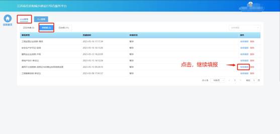 “草稿箱”板塊展示企業(yè)暫存的、未提交的或者撤回的事項(xiàng)申請(qǐng),點(diǎn)擊列表記錄中的“繼續(xù)填報(bào)”可進(jìn)入申請(qǐng)頁(yè)面繼續(xù)填報(bào)。