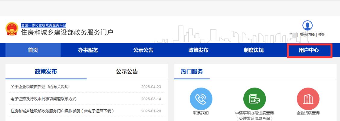 二、登錄法定代表人賬號綁定企業使用法定代表人賬號登錄以后,點擊“用戶中心”。