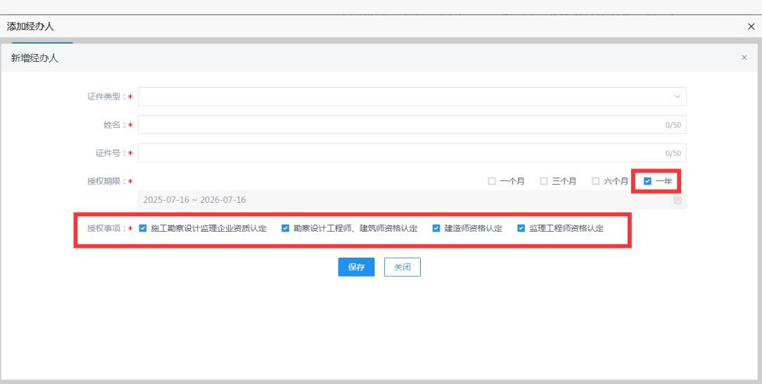 填寫經辦人賬號信息(需要先注冊好經辦人個人賬號),勾選授權項,選擇授權時間以后,點擊“保存”。