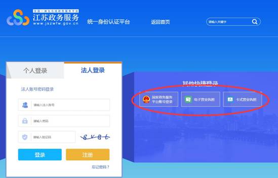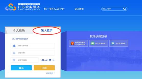 1、江蘇省政務服務網(wǎng)用戶登陸與注冊企業(yè)用戶至“江蘇省政務服務網(wǎng)”“江蘇住建廳旗艦店”“企業(yè)服務”“施工資質(zhì)及安全生產(chǎn)許可證”“法人登錄”模塊(http://www.jszwfw.gov.cn/jsjis/front/login.do?uuid=Jlb0eF7WUuM3)直接登陸或注冊法人賬戶。