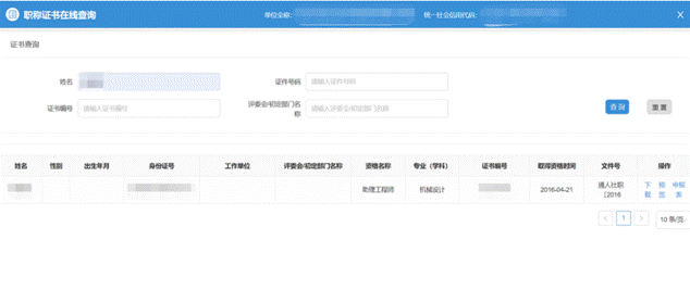 單位登錄根據個人信息查詢其對應的職稱證書信息。
