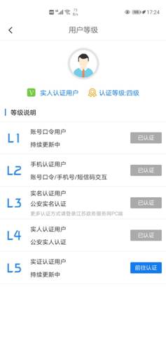 2.實名認證。二級注冊建造師本人通過手機下載“江蘇政務服務”APP,點擊“我的”→“立即登錄”,通過選擇“我要注冊”、“支付寶”、“我的南京”等方式進行注冊登錄,在姓名處下方點擊“實人認證用戶” →“用戶等級”內進行L4級別實名認證。