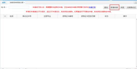 1、企業進入“江蘇省建筑業監管信息平臺2.0”建造師注冊欄目,打開“二級建造師初始注冊”頁面,點擊新增申請,如下圖所示:
