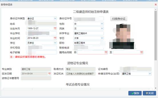 2、錄入二級注冊建造師身份證號碼,自動獲取到二級注冊建造師信息,填寫合同日期等相關信息后,點擊保存,并上傳附件資料,如下圖所示: