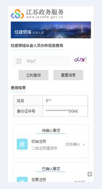 3.事項確認。已完成L4級別實名認證的二級注冊建造師本人,應在發起注冊申請5日內進入“江蘇政務服務”手機APP,點擊 “首頁”→“江蘇政務服務·南京”→“人才服務”→“證書辦理”欄內“住建領域從業人員” →進入應用。在“住建領域從業人員”應用內輸入驗證碼→點擊“立刻查詢”→“待確認事項”里,根據查詢結果對申報業務信息“點擊確認”,并根據提示點擊“同意辦件”,進行人臉識別確認(詳見附件:二級注冊建造師注冊申報操作手冊)。
