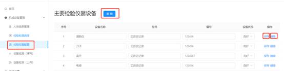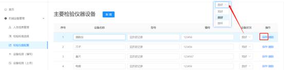 1.在儀器列表中,選擇某單項(xiàng)設(shè)備名稱,點(diǎn)擊輸入框可編輯修改設(shè)備名稱、型號(hào)、編號(hào),點(diǎn)擊操作欄中保存即為修改成功。如下圖所示。