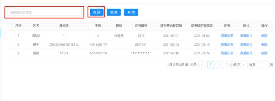 輸入姓名點(diǎn)擊【查詢】,點(diǎn)擊【查看證書(shū)】可查看人員證書(shū)信息。點(diǎn)擊【重置】可清空輸入框內(nèi)容。