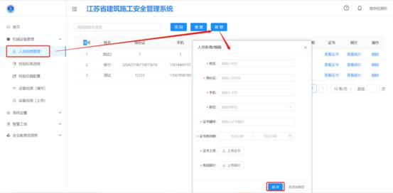 點(diǎn)擊【新增】按鈕,進(jìn)入新增頁(yè)面,填寫檢驗(yàn)檢測(cè)人員信息,填寫完成后點(diǎn)擊【保存】。