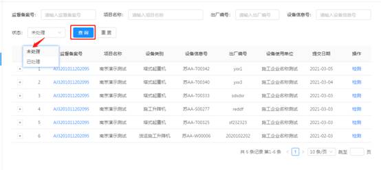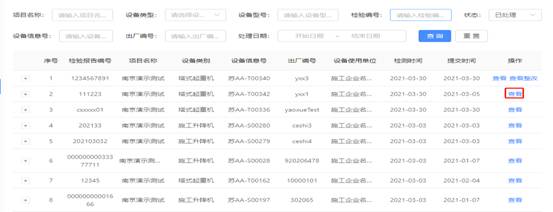 檢驗(yàn)檢測(cè)機(jī)構(gòu)頁(yè)面下機(jī)械設(shè)備存在【已處理】、【未處理】、【整改中】三種狀態(tài)。【已處理】表示設(shè)備已完成檢測(cè)流程,【未處理】表示設(shè)備尚未開(kāi)始檢測(cè)流程,【整改中】表示設(shè)備已開(kāi)始檢測(cè)流程,因存在需整改的不合格項(xiàng),處于整改過(guò)程中。