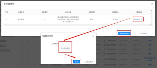 選擇【是】,彈出提示框,顯示具體不合格項(xiàng)及描述。上傳照片點(diǎn)擊【保存】,編輯完成后點(diǎn)擊【通知項(xiàng)目整改】。