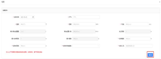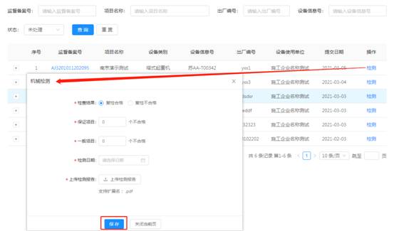 選擇需檢測(cè)的設(shè)備,點(diǎn)擊操作欄中的【檢測(cè)】,進(jìn)入檢測(cè)頁(yè)面。按要求填寫檢測(cè)基本信息,“*”為必填項(xiàng),輸入完后點(diǎn)擊【保存】。