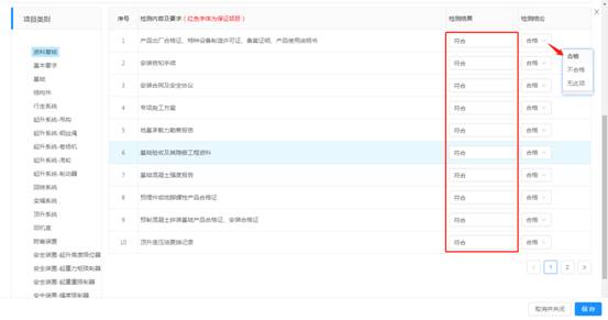 按項(xiàng)目類別逐一填寫,檢測(cè)結(jié)果為輸入框(輸入框?yàn)楸靥睿礄z測(cè)情況如實(shí)填寫;檢測(cè)結(jié)論為選擇框,選擇【合格】/【不合格】/【無(wú)此項(xiàng)】,點(diǎn)擊【保存】。