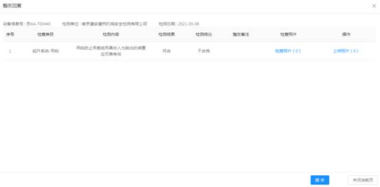 點(diǎn)擊菜單欄的起重機(jī)械管理—>設(shè)備檢測(cè),需整改的檢測(cè)機(jī)械設(shè)備顯示在列表中的第一條,最新?tīng)顟B(tài)欄顯示待整改狀態(tài)及操作欄出現(xiàn)【整改回復(fù)】按鈕,點(diǎn)擊查看【整改回復(fù)】按鈕可查看需整改的具體不合格項(xiàng)。