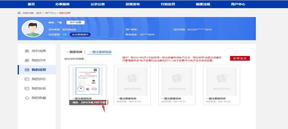 若“我的證照”頁面已顯示“一級注冊建造師注冊證書”,可直接點擊查看詳情;若“我的證照”頁面未顯示“一級注冊建造師注冊證書”,點擊[查看更多]。
