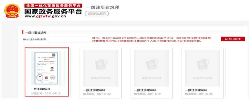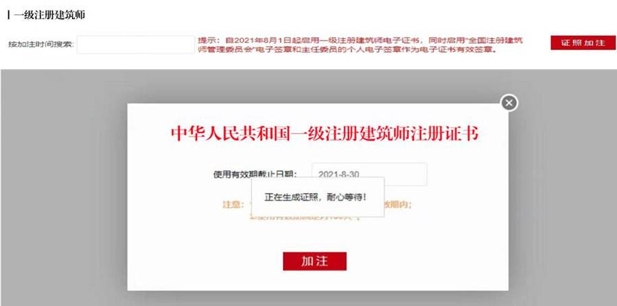 選擇“一級注冊建造師”,點擊[證照加注],即可加注成功。首次使用或之前加注日期已過期,點擊頁面右上角[證照加注],在彈窗頁面繼續點擊[加注],提示“加注成功!”表示電子證書加注完成,加注有效期為180天。
