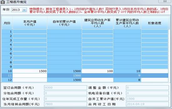 “逐月信息”(29欄)點(diǎn)開(kāi)后出現(xiàn)的小窗口,既能看到工程1-12月份所上報(bào)的產(chǎn)值和平均人數(shù)的逐月信息,還能錄入和修改報(bào)告期完成的產(chǎn)值和平均人數(shù)(見(jiàn)下圖)。