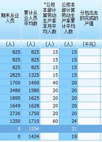 B)報(bào)表中“累計(jì)計(jì)算建筑業(yè)勞動(dòng)生產(chǎn)率平均人數(shù)”中不包括工程庫(kù)中勞務(wù)分包工程的平均人數(shù)。要求按報(bào)告期工程庫(kù)中“累計(jì)勞動(dòng)生產(chǎn)率平均人數(shù)”指標(biāo)下方的“求和數(shù)”+報(bào)告期附庫(kù)一中“公司本部計(jì)算勞動(dòng)生產(chǎn)率累計(jì)平均人數(shù)”=報(bào)告期附庫(kù)一中“從業(yè)人員期末人數(shù)”之和/報(bào)告期“日歷月數(shù)”。