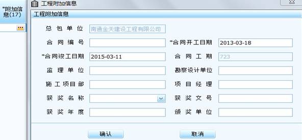 日期格式一律按照國(guó)際短日期格式10位數(shù)錄入(即年為4位,月為兩位,日為兩位,年、月、日中間加“-”,如2013年6月8日,錄入格式是2013-06-08)。單擊“附加信息”(17欄)中的“小按鈕”,彈出“工程附加信息”小窗口后(見(jiàn)下圖),錄入相關(guān)內(nèi)容后點(diǎn)“確認(rèn)”。工程承包形式是總包的,總包單位名稱(chēng)是默認(rèn)的,工程承包形式是分包的,一定要填總包單位的名稱(chēng)。