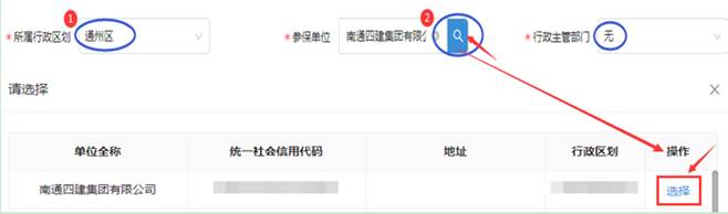 參保單位:輸入單位全稱“南通四建集團有限公司”或單位社會信用統一代碼,點擊搜索按鈕后,點擊選擇(該步驟不可省略);